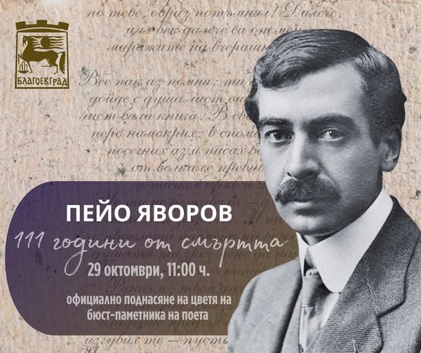 На 29 октомври в Благоевград ще бъдат отбелязани 111 години от смъртта на поета и революционер Пейо Яворов.