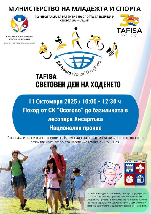 БЪЛГАРСКА ФЕДЕРАЦИЯ СПОРТ ЗА ВСИЧКИ /БФСВ/ съвместно с ОБЩИНА КЮСТЕНДИЛ, организират за 33-ти пореден път национална спортна проява – Световен ден на ходенето 2025. Проявата се осъществява с финансовата подкрепа на Министерството на младежта и спорта по „Програма за развитие на спорта за всички и спорта за учащи“ и е част и в изпълнение на Националната програма за физическа активност и развитие на българското население БУЛФАР 2025 – 2028.