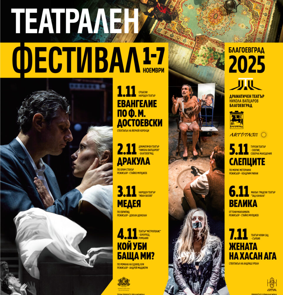 На 2 ноември (19:00) домакините от ДТ „Никола Вапцаров“ – Благоевград представят най-новото си заглавие от репертоара на театъра – „Дракула“ по Брам Стокър, реж. Стайко Мурджев – визуално мощен и драматургично дързък прочит на класиката, с невероятното участие на актрисата Койна Русева в образите на Дракула и проф. Ван Хелсинг.