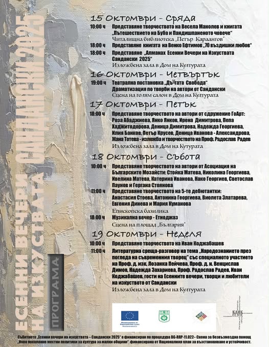 Събитието „Есенни вечери на изкуствата – Сандански 2025“ е финансиран по процедура BG-RRP-11.022– Схема за безвъзмездна помощ „Ново поколение местни политики за култура за малки общини“, финансирана от Националния план за възстановяване и устойчивост.