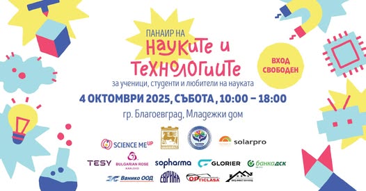 За втора поредна година ScienceMeUp (Университет за деца) и община Благоевград организират Панаир на науките и технологиите. През целия ден на 4 октомври (събота) от 10:00 ч. до 18:00 ч. в Младежкия дом граждани и гости на град Благоевград ще могат напълно свободно да посетят научни и технологични щандове. Посетителите ще наблюдават удивителни експерименти по природни науки и ще се запознаят с вълнуващи инженерни инсталации от света на роботиката и автоматизацията.
