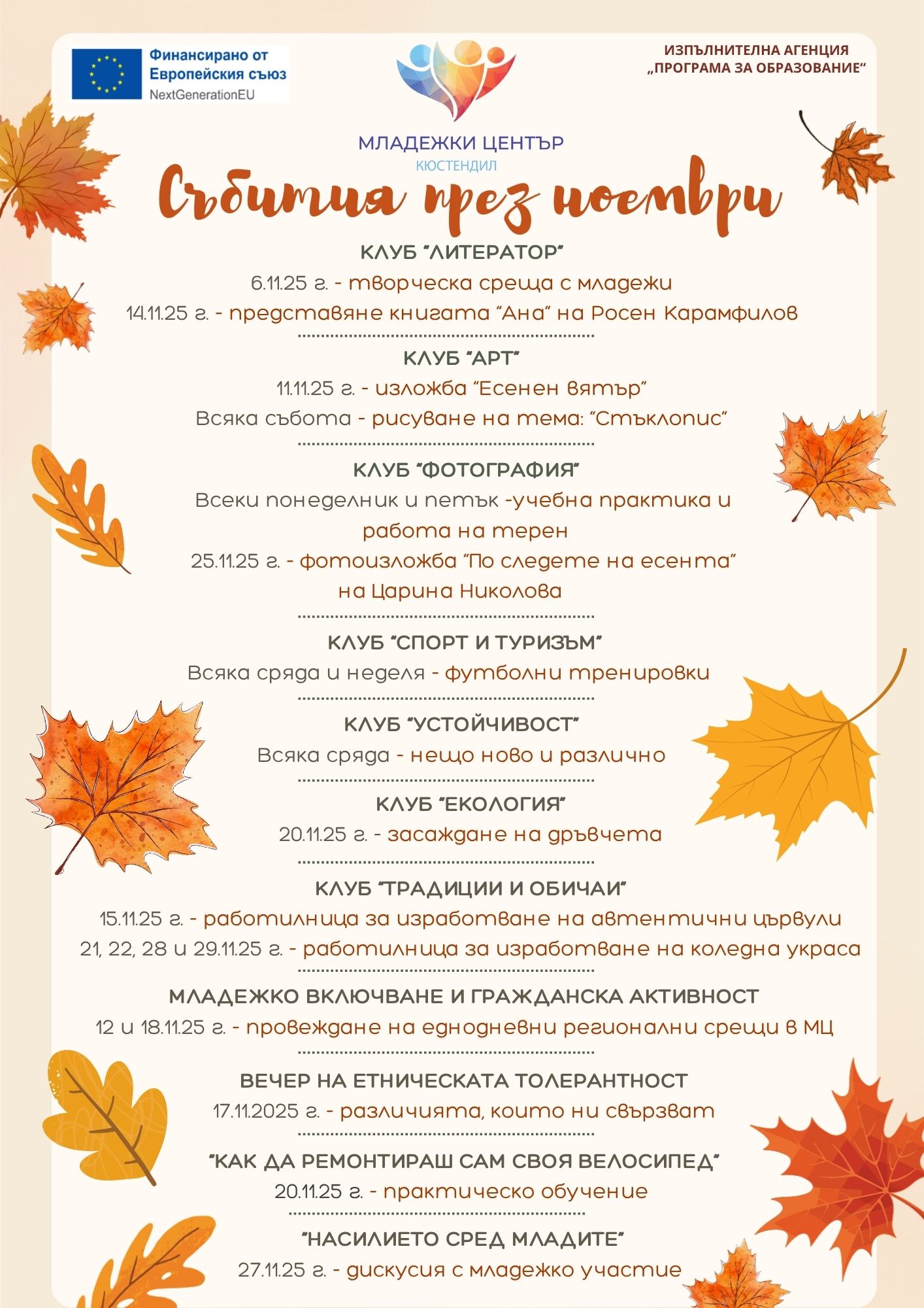 Под усмивката на есента Младежки център Кюстендил отново се превръща в сцена на млади таланти, идеи и емоции. През идните дни ни очаква наситена програма, която ще ни подари изкуство, срещи и споделени преживявания.