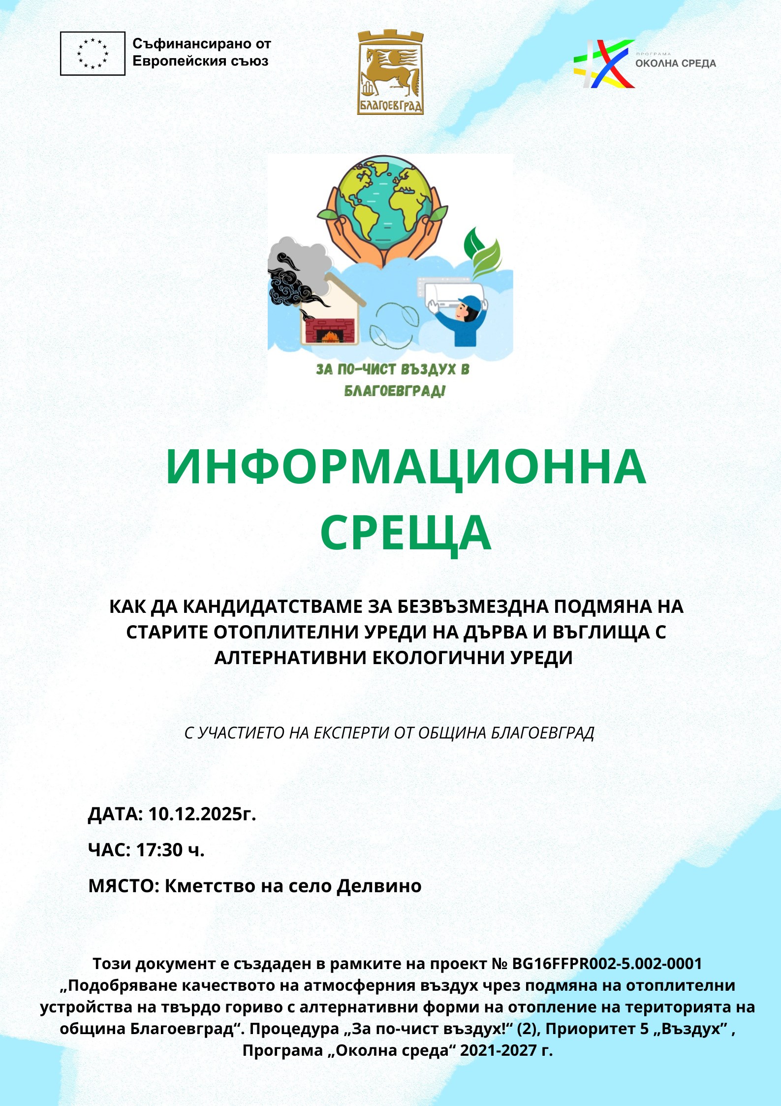 На 10 декември 2025 г. (сряда) от 17:30 ч., в кметството на с. Делвино, Община Благоевград ще проведе разяснителна среща с жителите на населеното място, посветена на възможностите за безплатна подмяна на остарелите отоплителни уреди, използващи твърдо гориво, със съвременни, по-ефективни и щадящи околната среда системи.