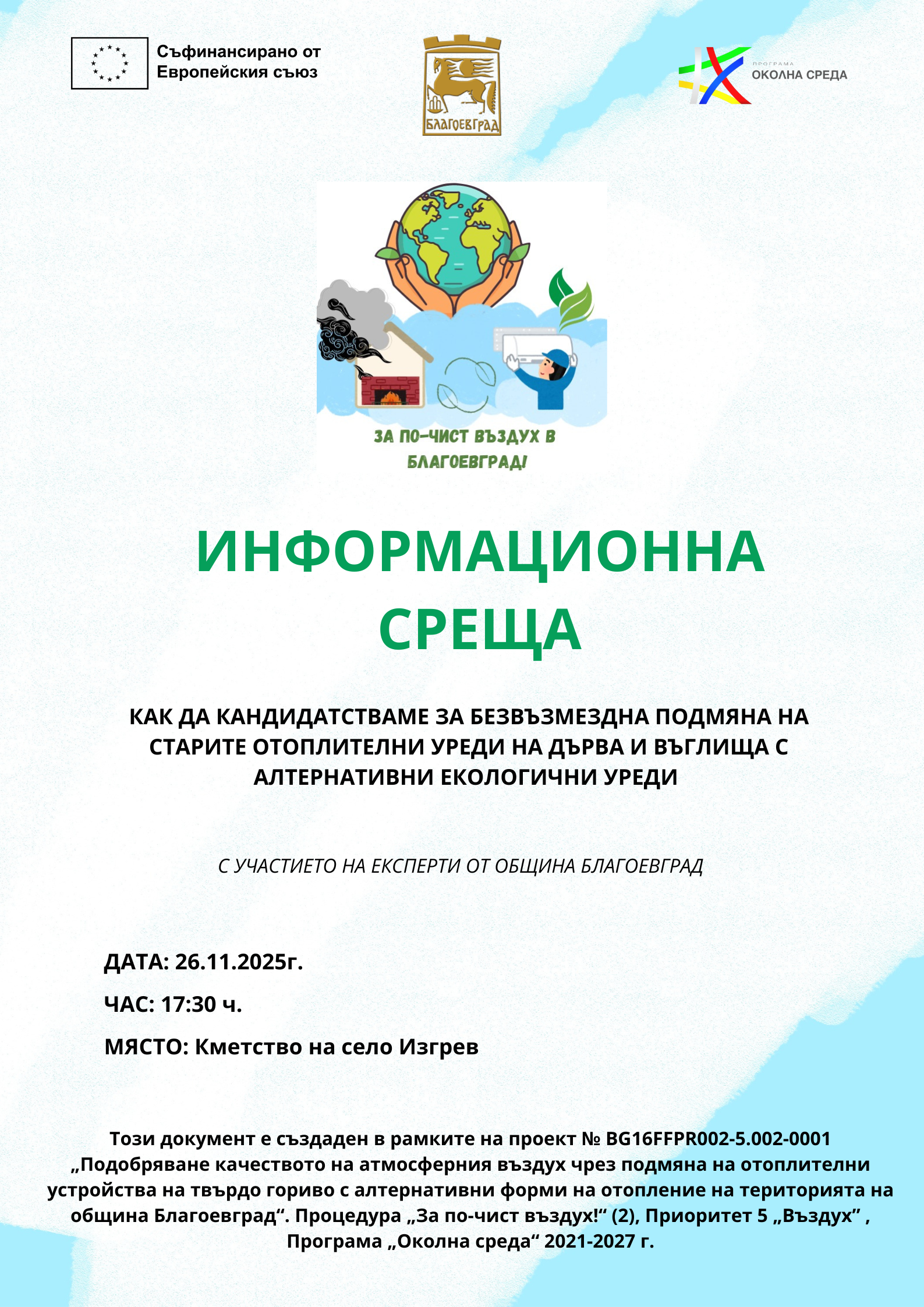 На 26 ноември 2025 г. (сряда) от 17:30 ч. в Кметството на село Изгрев Община Благоевград организира информационна среща с жителите на населеното място, посветена на възможностите за безплатна подмяна на старите отоплителни уреди на дърва и въглища със съвременни, енергийно ефективни и щадящи околната среда системи.