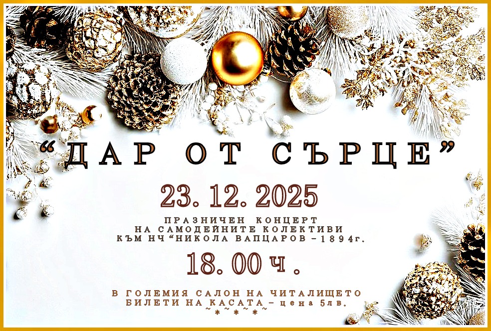 Концертът „Дар от сърце“ е покана, за да събере всички в магията на Коледа и да подари най-ценното – усмивка, благопожелания и светлина за празниците. Това е вечер, в която традицията среща съвремието, а читалището отново доказва своята роля на духовен дом и пазител на българския дух