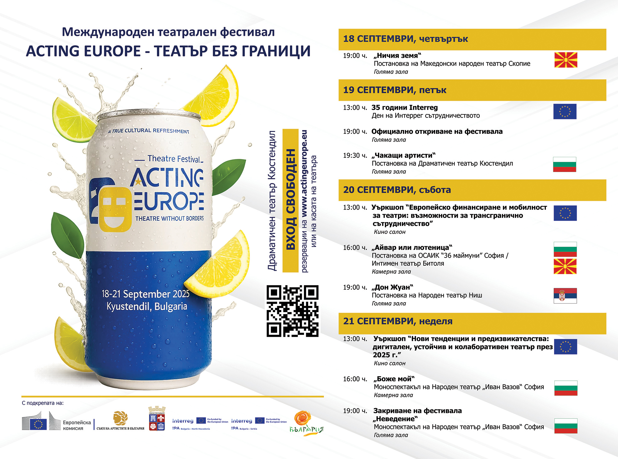 От 18 до 21 септември – запазете датите и станете част от театралния празник „Acting Europe – Театър без граници“ в Кюстендил – културната столица на региона!