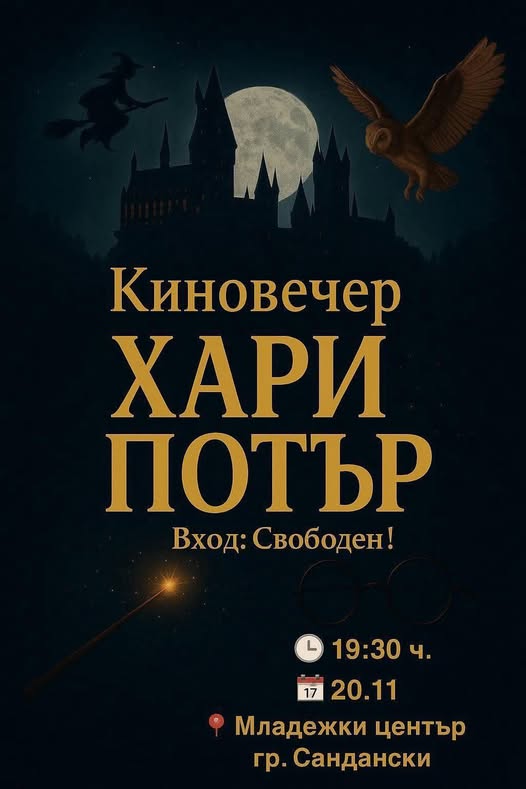 Този четвъртък от 19:30 ч. Младежки център Сандански ще се превърне в истински Хогуортс, защото ви очаква специална кино вечер на тема „Хари Потър“!