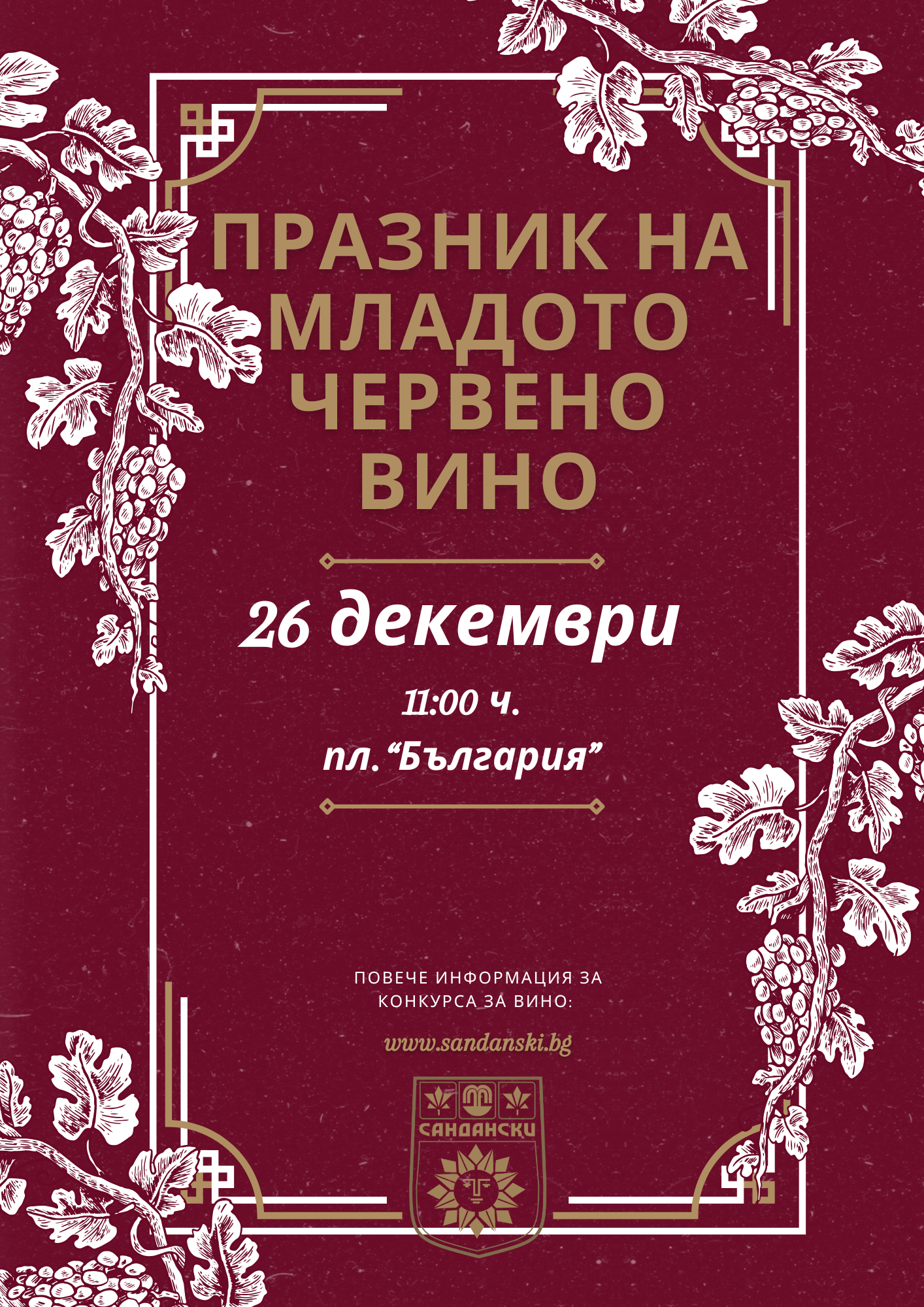 На 26.12.2025 г. от 11:00 ч. на площад „България” ще се проведе Празник на младото червено вино.