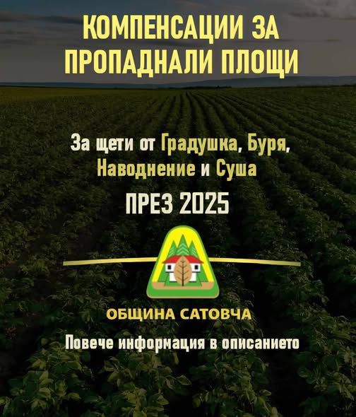 От 2 февруари 2026 г. земеделските стопани могат да подават заявления за подпомагане за 100% пропаднали площи, засегнати от градушка, буря и проливен дъжд, наводнение и суша, настъпили през 2025 г. Това съобщават от Общинска администрация – Сатовча, която информира заинтересованите лица за старта на процедурата.