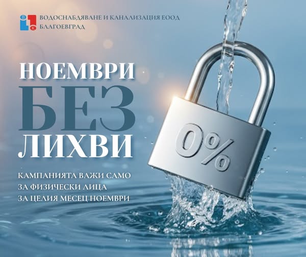 В рамките на целия месец ноември, „Водоснабдяване и канализация“ ЕООД – Благоевград, дава възможност да заплатите своите просрочени НЕСЪДЕБНИ задължения (дължимата главница) БЕЗ натрупаната към тях лихва!