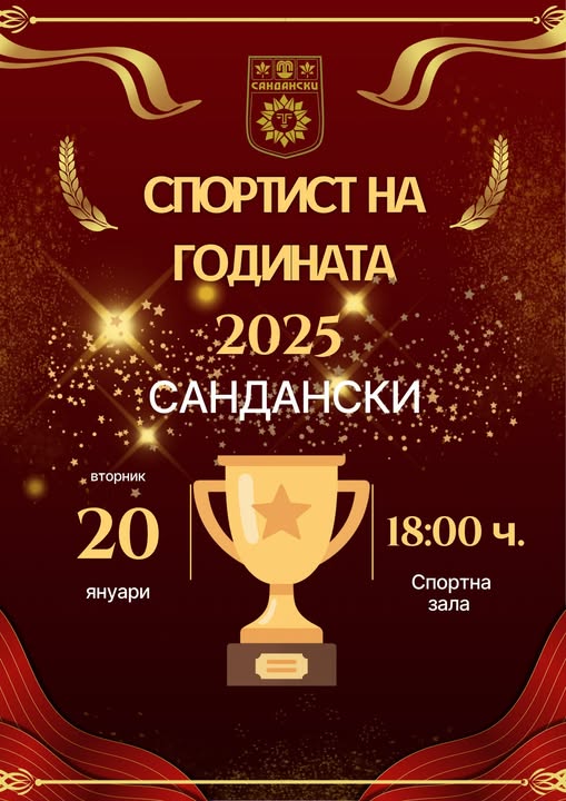 Община Сандански организира тържествена церемония, на която ще бъдат връчени наградите „Спортист на 2025 г.“, „Отбор на 2025 г.“ и „Треньор на 2025 г.“ – в знак на признание за постиженията и приноса към спорта през изминалата година.