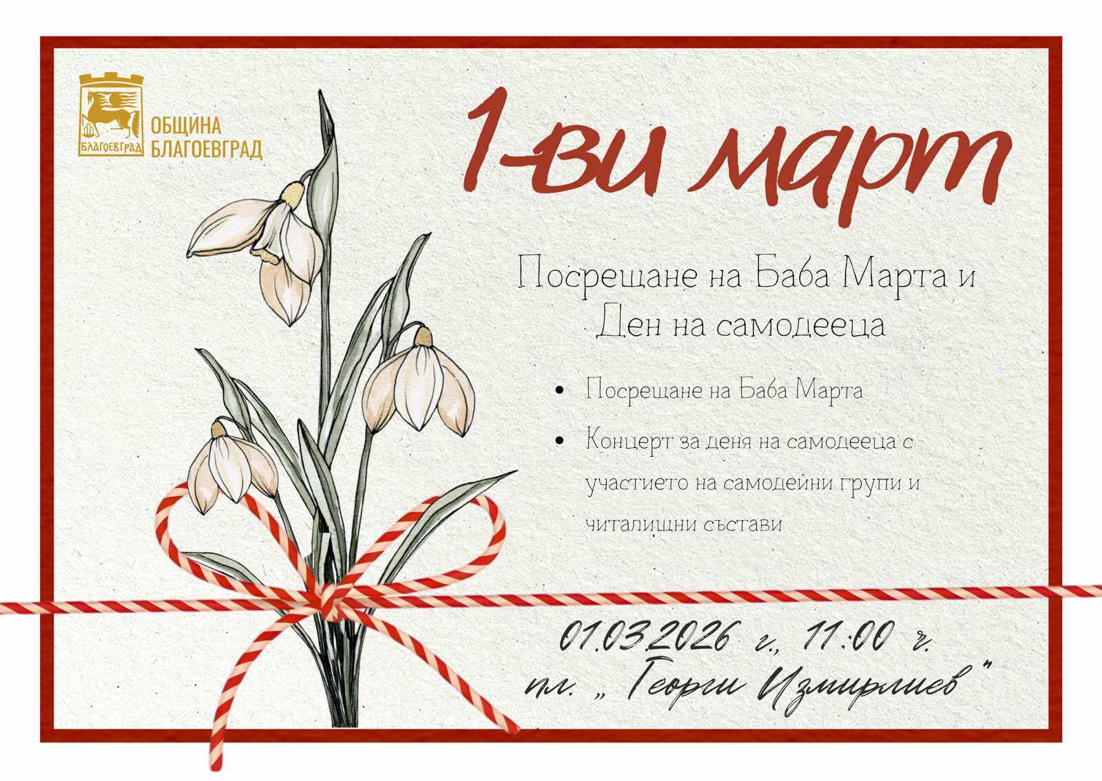Деца и възрастни ще могат да посрещнат самата Баба Марта в 11.00 часа на подплощадното пространство при пл. „Георги Измирлиев“ в Благоевград. Тя ще разкаже за древните български традиции, свързани със символа на мартеницата – обагрен в бяло и червено, носещ здраве, късмет и ново начало.