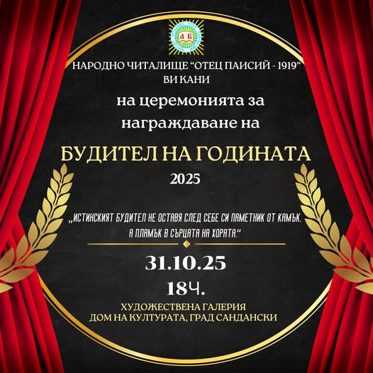 Събитието на НЧ „Отец Паисий – 1919“ ще се състои на 31 октомври 2025 година от 18:00ч. в Художествената галерия в Дома на културата, град Сандански.
