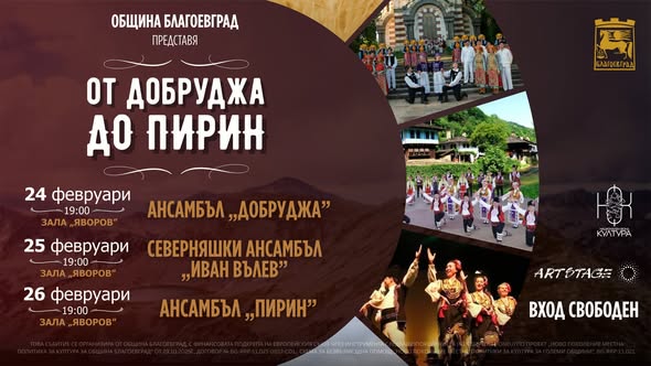 На 24, 25 и 26 февруари фолклорният фестивал „От Добруджа до Пирин“ обединява три знакови професионални ансамбъла, представящи различни етнографски области на България – Добруджа, Северняшката фолклорна област и Пиринския край и цели да превърне музиката и танца в духовен мост между региони, традиции и поколения.