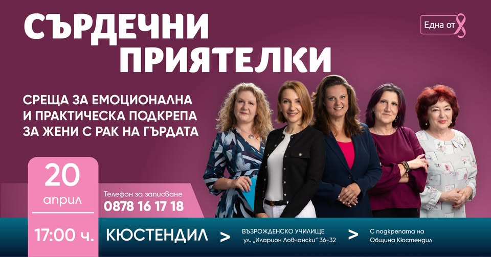 На 20 април 2026 г. (понеделник), от 17:00 до 19:00 ч., Фондация „Нана Гладуиш – Една от 8“, в рамките на мобилната програма „Сърдечни приятелки“, ще проведе специална среща с жени, диагностицирани с рак на гърдата.