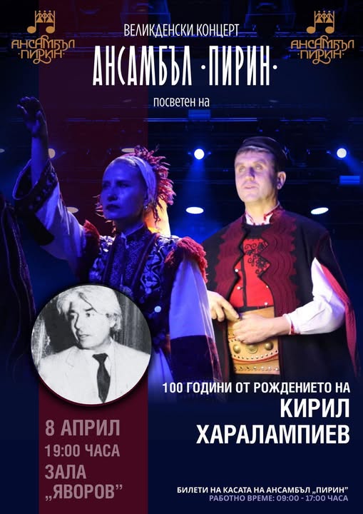 На 8 април от 19:00 часа в зала „П. Яворов“ ще се състои празничен концерт на Ансамбъл „Пирин“, посветен на 100-годишнината от рождението на легендарния хореограф Кирил Харалампиев.