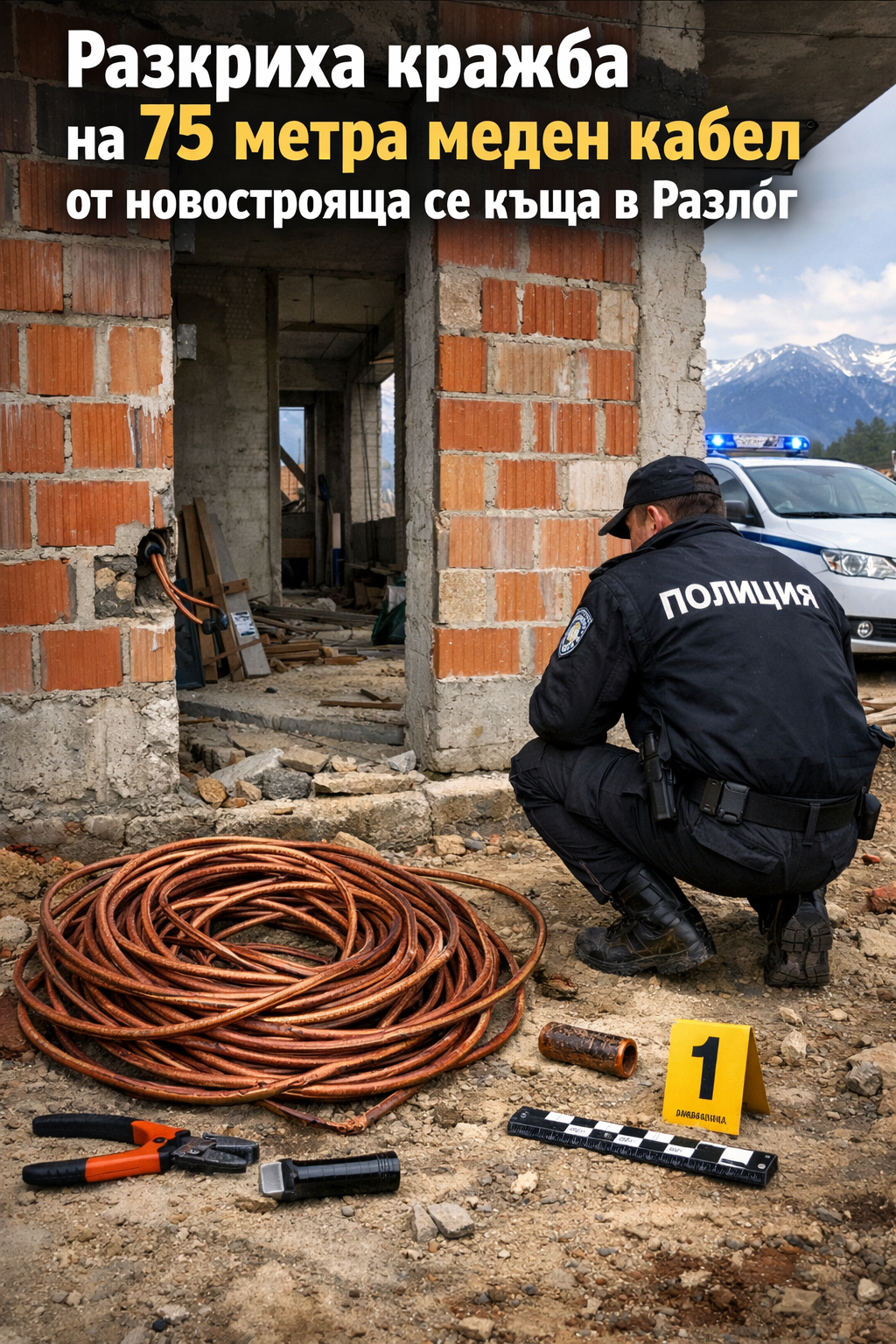 След получено съобщение от жител на гр. Разлог, че за времето от 15:00 часа на 09.02.2026 г. до 09:00 часа на 10.02.2026 г. е извършена кражба на около 75 метра меден захранващ кабел от новострояща се къща в гр. Разлог, от работещите по случая полицейски служители е установено, че съпричастни към извършеното деяние са 45-годишен мъж, две жени на 30 и 47 години и непълнолетен младеж, всички от гр. Разлог. По случая е образувано досъдебно производство.